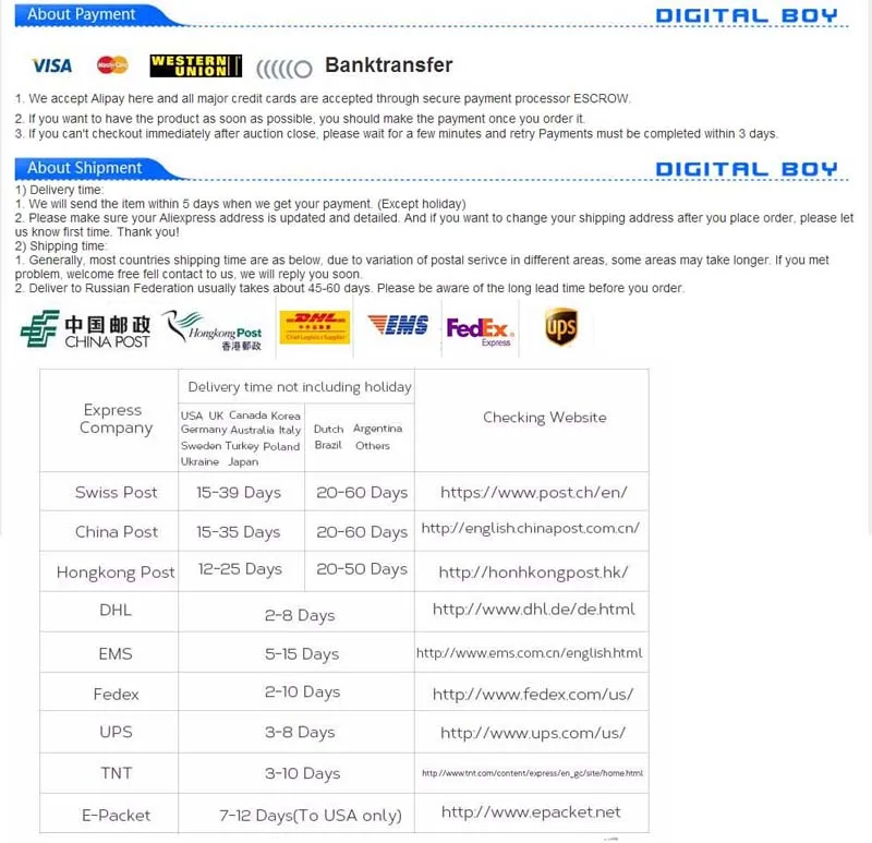 B–If you ship by DHL, UPS or others, we are not able to receive it due to China Custom regulation.Please contact us for return address and details before you send the item back. We do not accept any returns without previous notice.Please ensure the item will be returned in good condition with the original packaging. We will send new replacement or refund once the item is received.